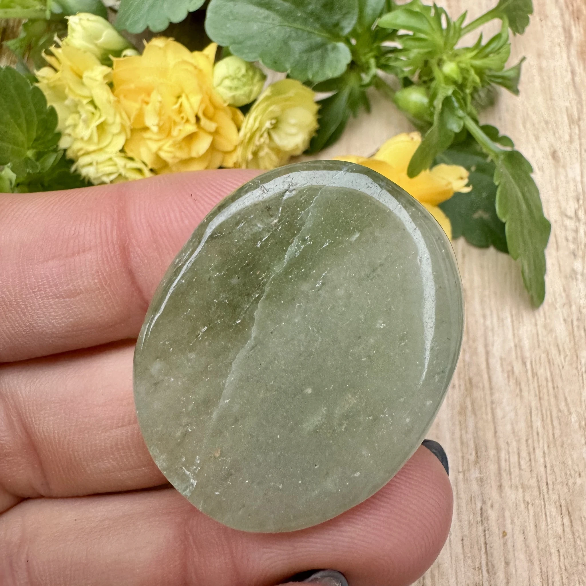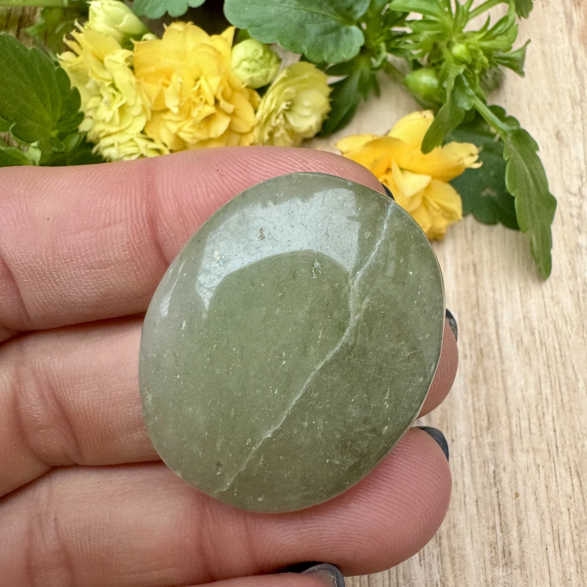 Aventuriinist lapikuks lihvitud tagaosaga ehtekivi ehk cabochon.