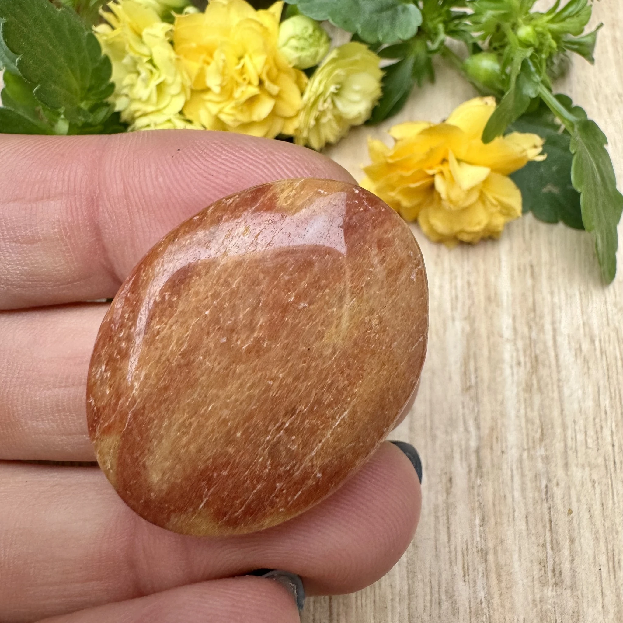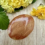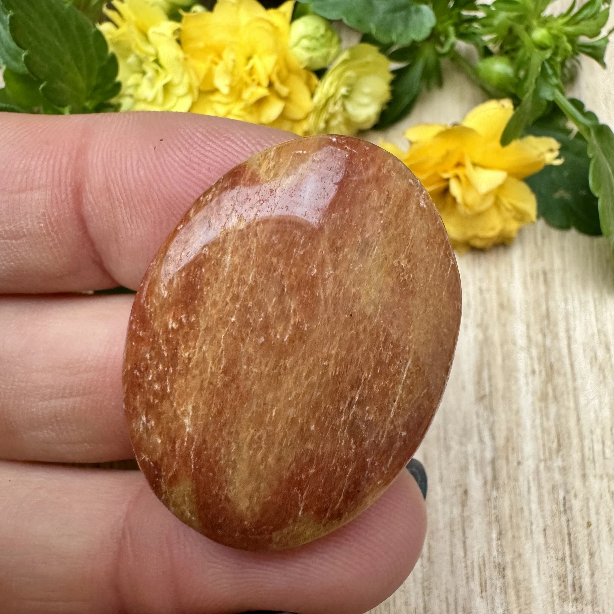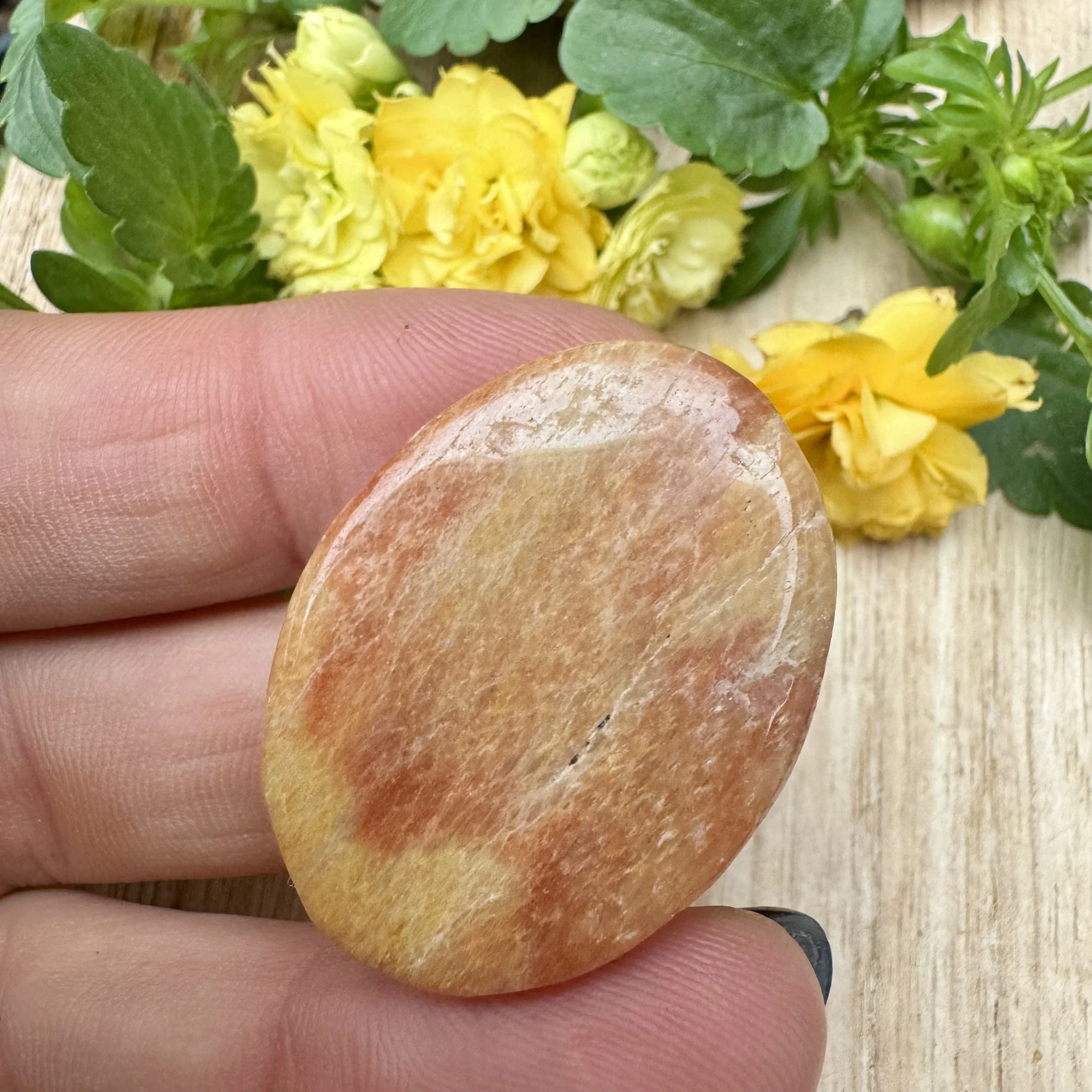 Lihvitud värvilisest feldsparist cabochon ehk lapik ehtekivi.