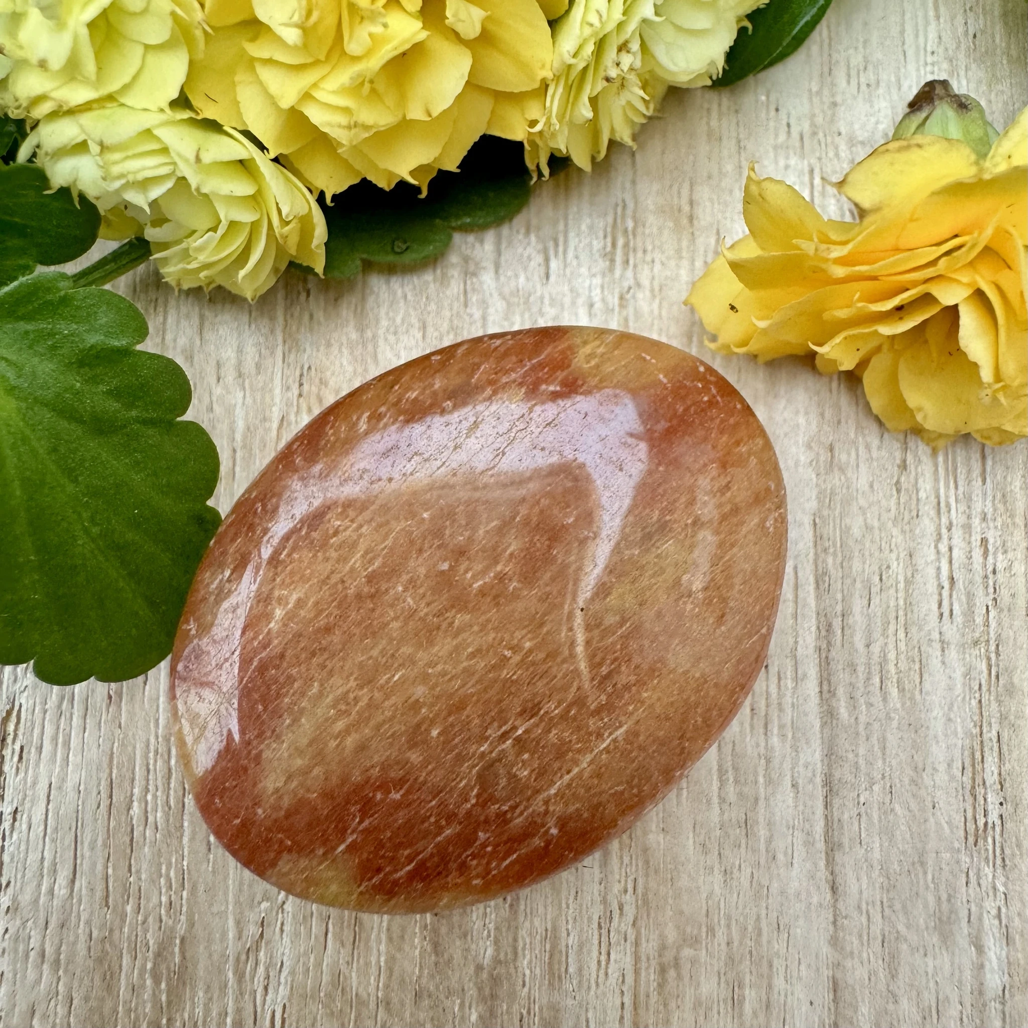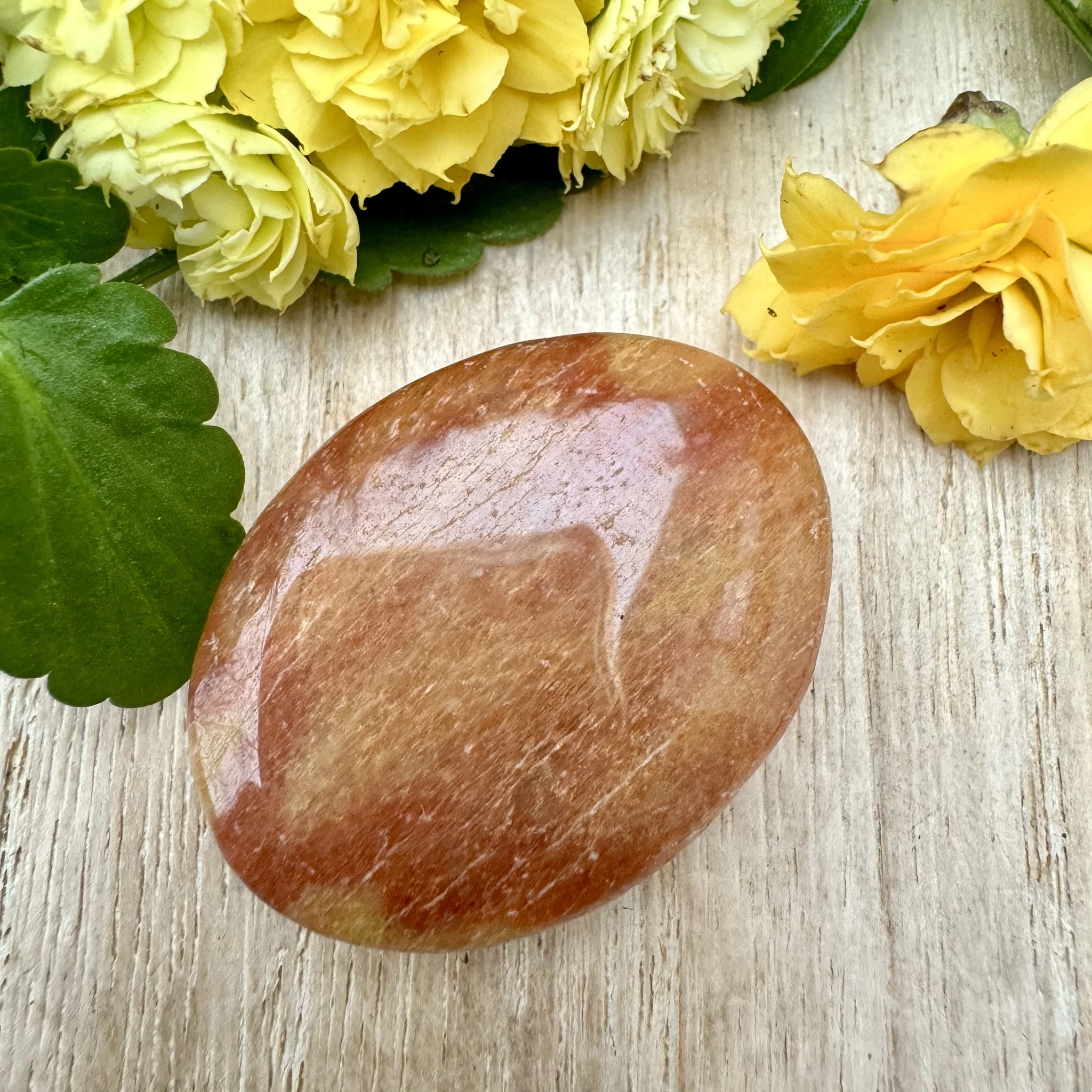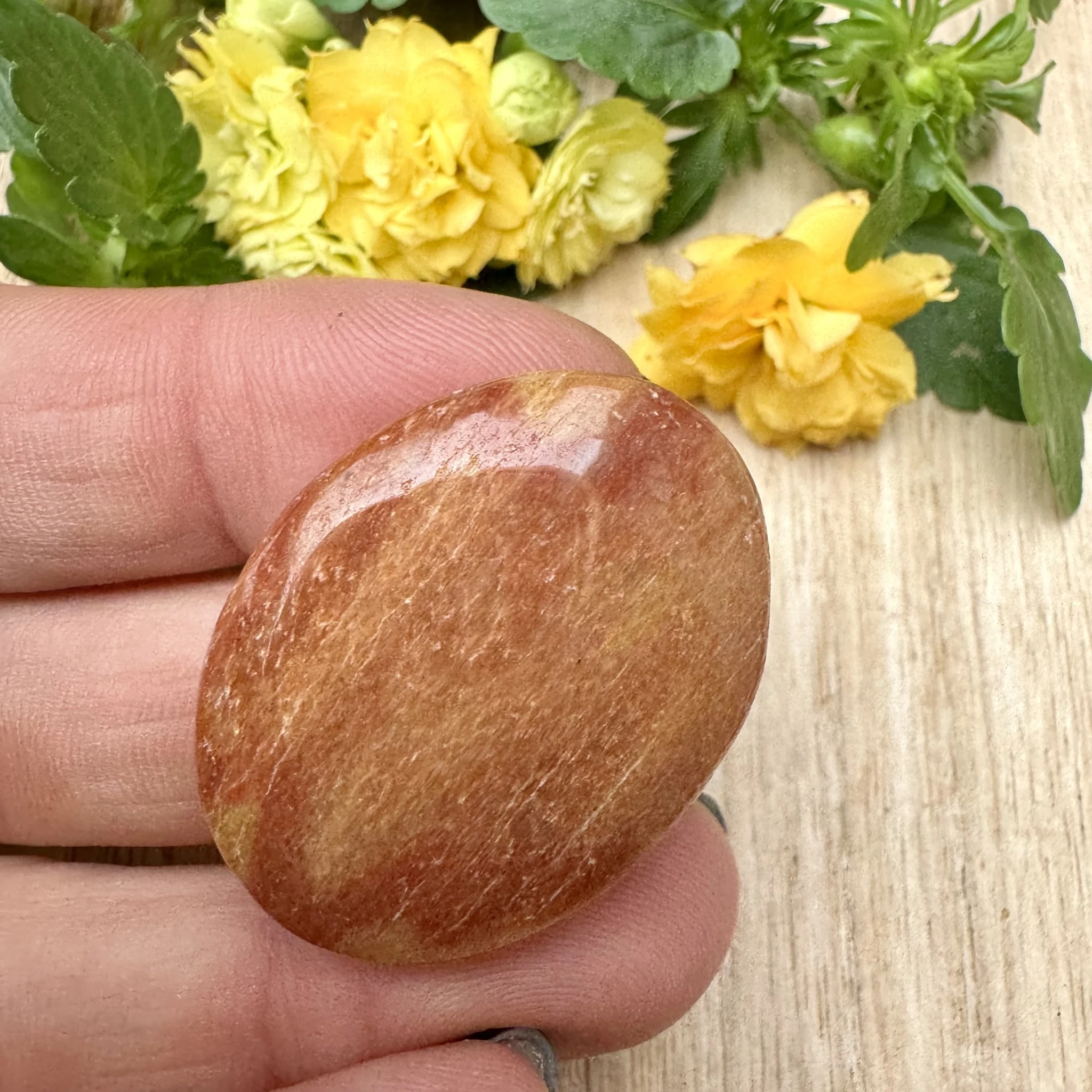 Lihvitud värvilisest feldsparist cabochon ehk lapik ehtekivi.
