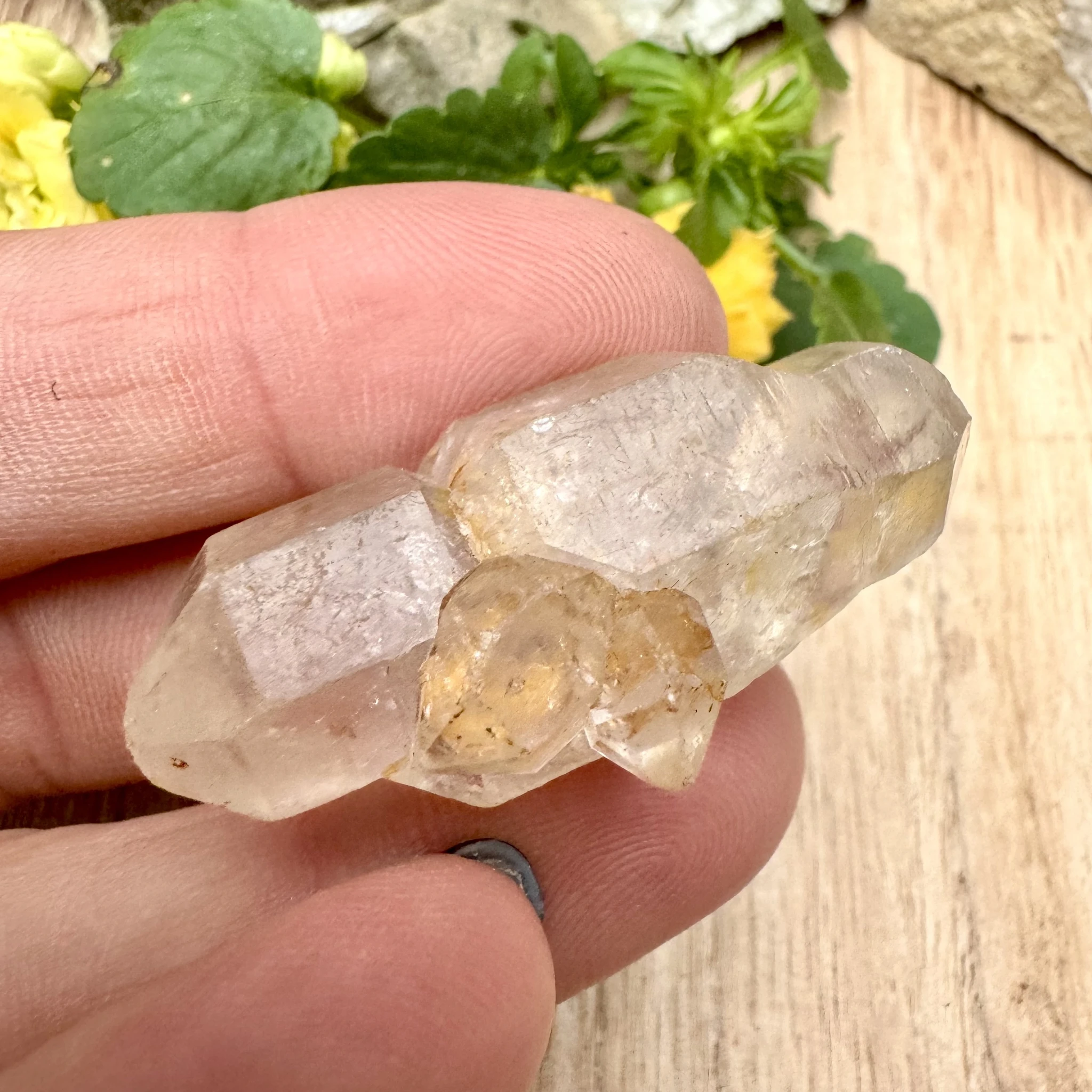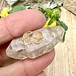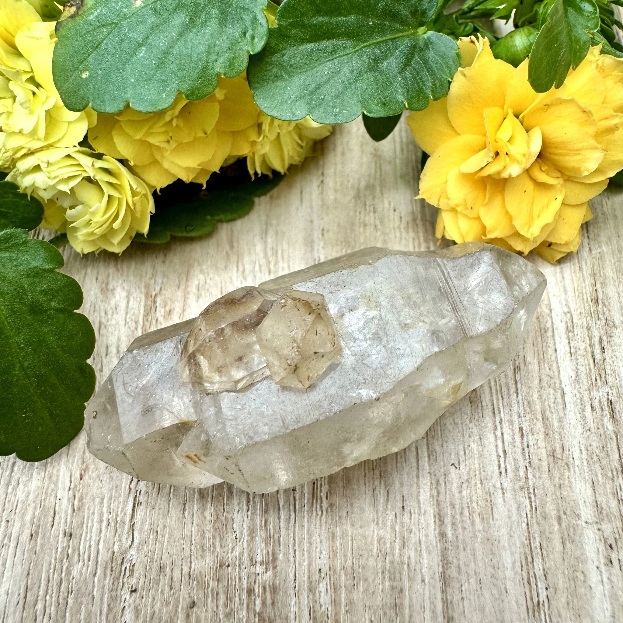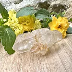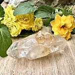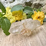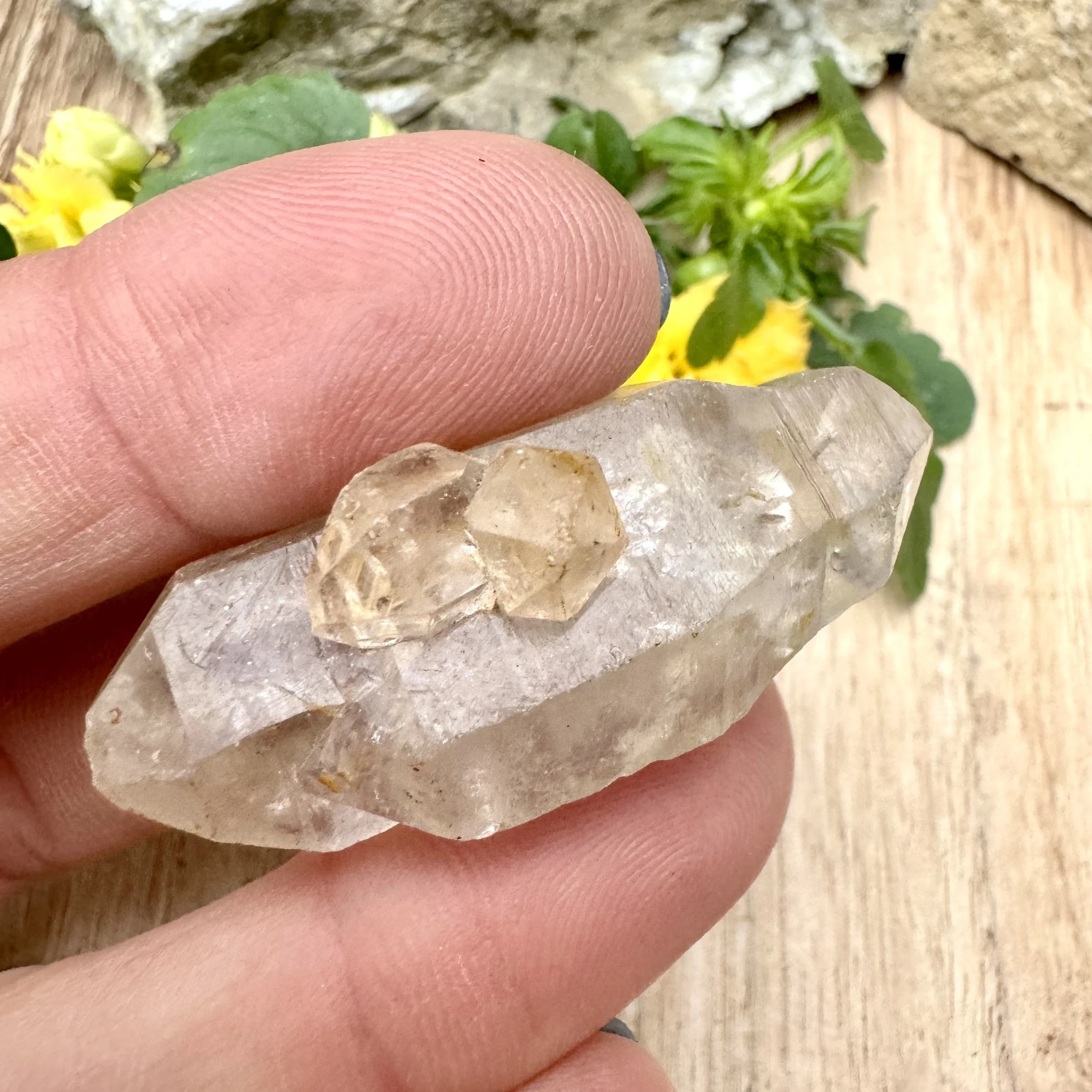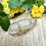 Eriline mäekristallist tippudega varras (looduslik, lihvimata). Väikestest tippudest leiad mõned rutiili suletised.