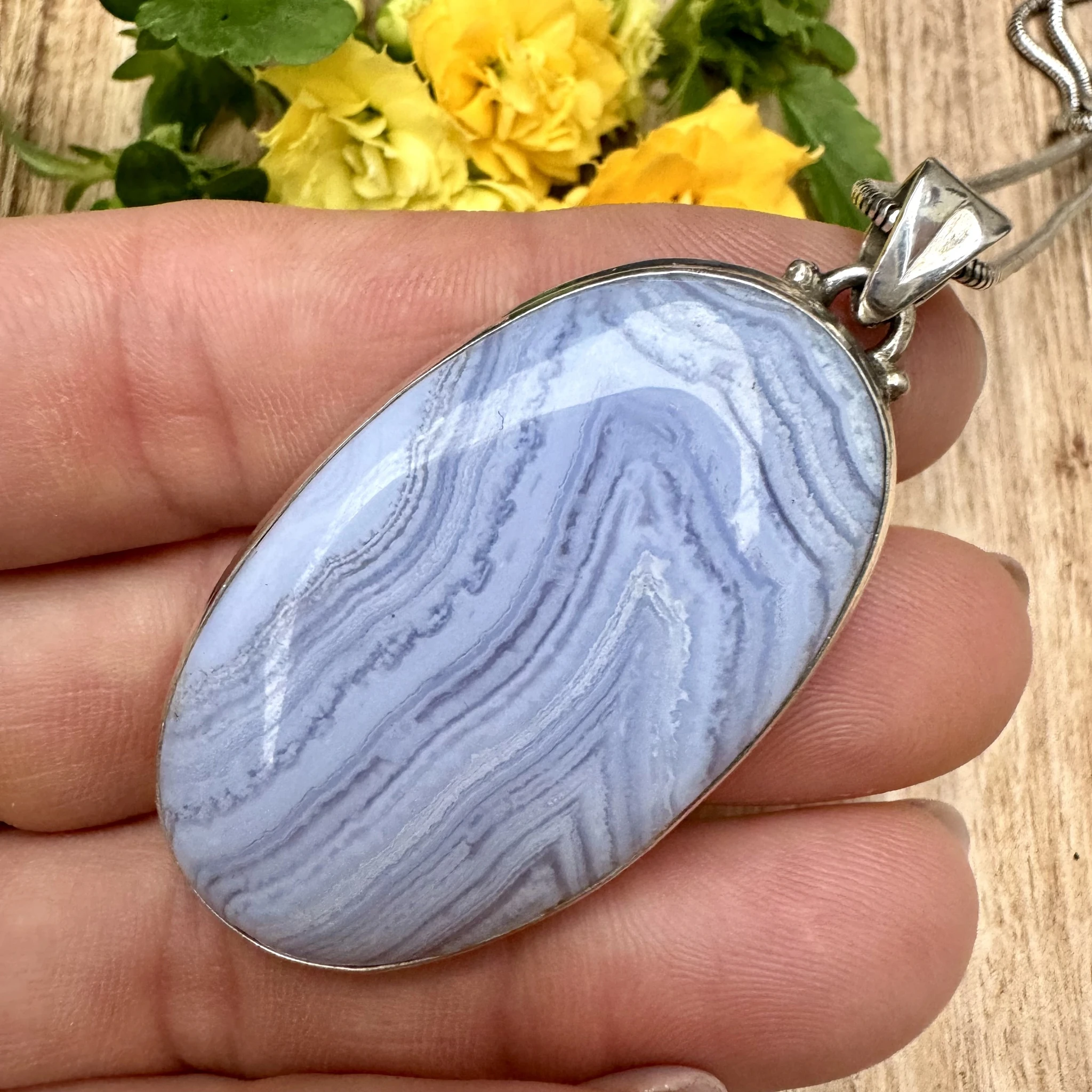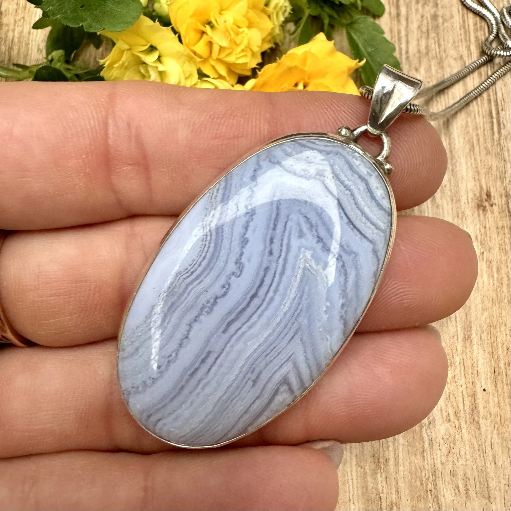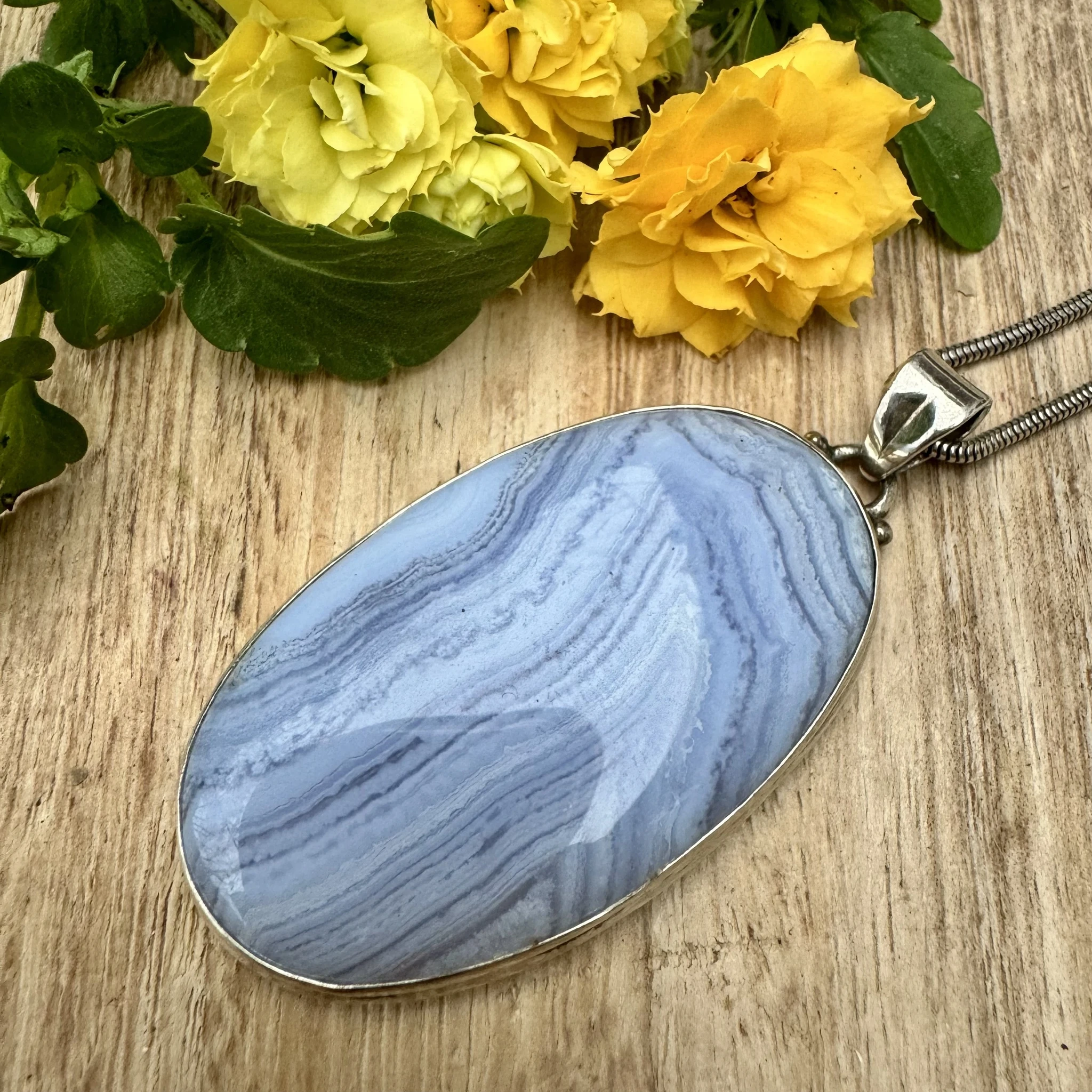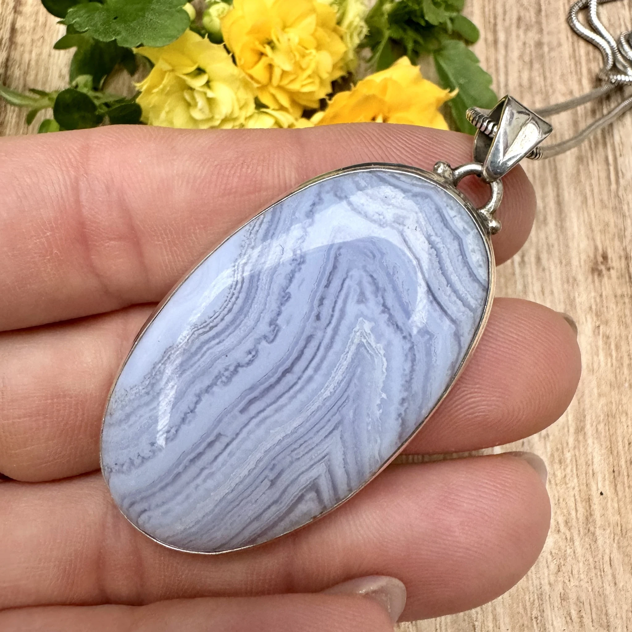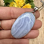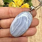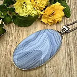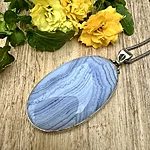 Sinine pitsahhaat on leebe kristall. Ta leevendab kandja õlul olevat koormat, aitab jagu saada hirmudest ja foobiatest, soodustab kommunikatsiooni ning vihast lahti laskmist. Sinine pitsahhaat inspireerib, rahustab, leevendab stressi ja soodustab armulikkust enda ja teiste suhtes.