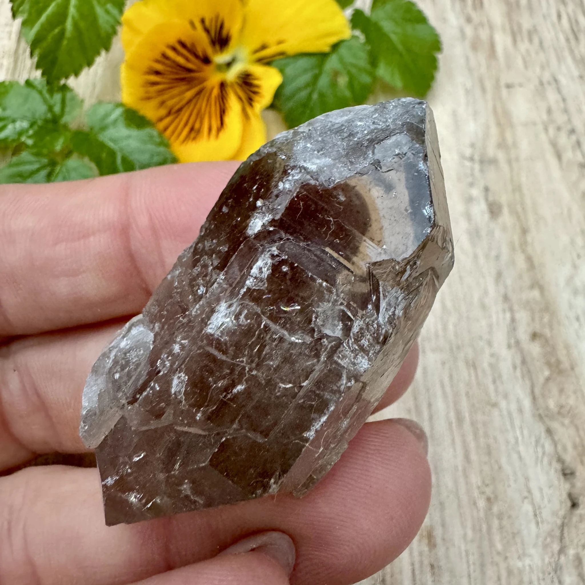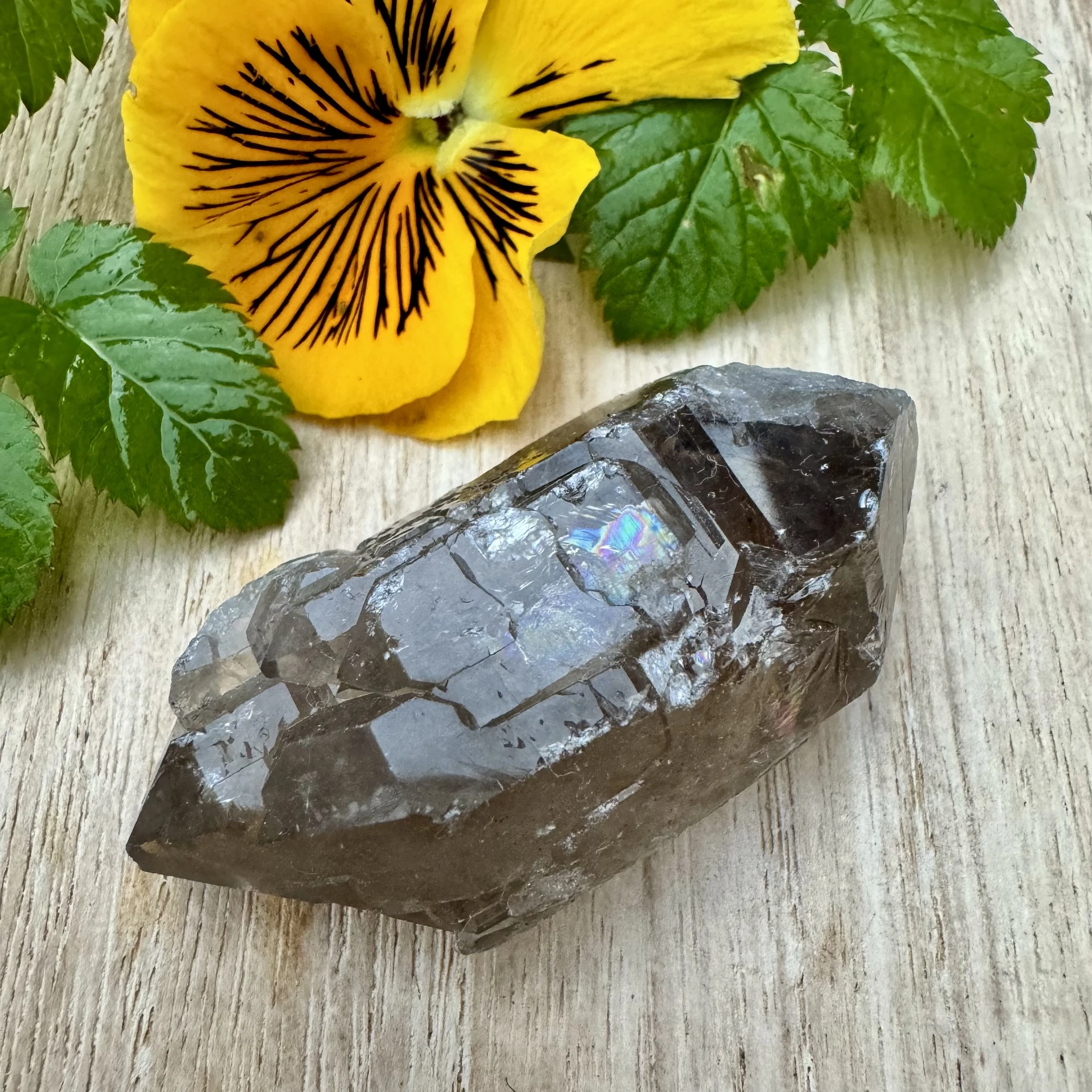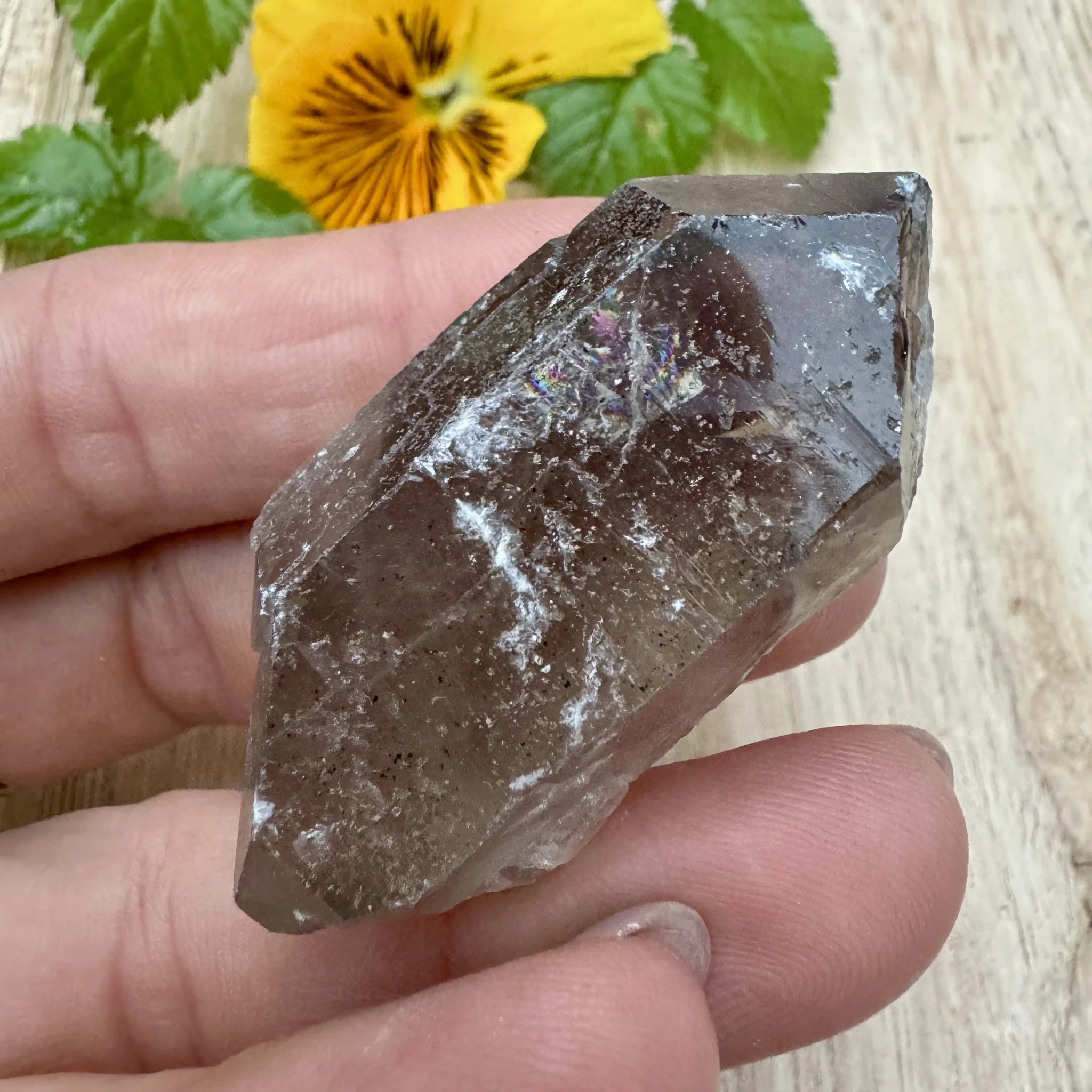 Suitskvartsi looduslik murtud (lihvimata) kahe tipuga varras). Kristallist leiad imeilusa kvartsidele omase "vikerkaare".